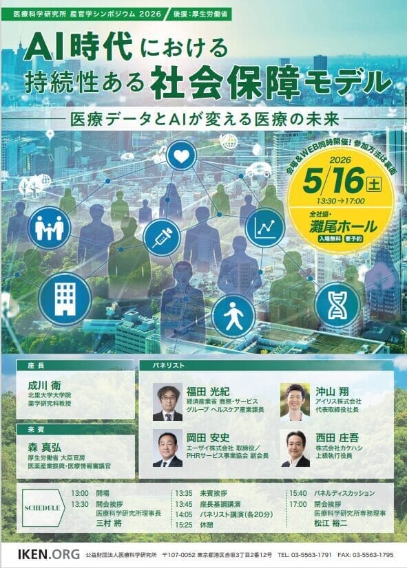 本シンポジウムでは、「AI時代における持続性ある社会保障モデル-医療データとAIが変える医療の未来-」をテーマに、医療データの利活用やAI技術の応用による予測型医療・個別化医療の可能性、ならびにアウトカム志向の社会保障のあり方について、産官学の有識者による議論が行われます。